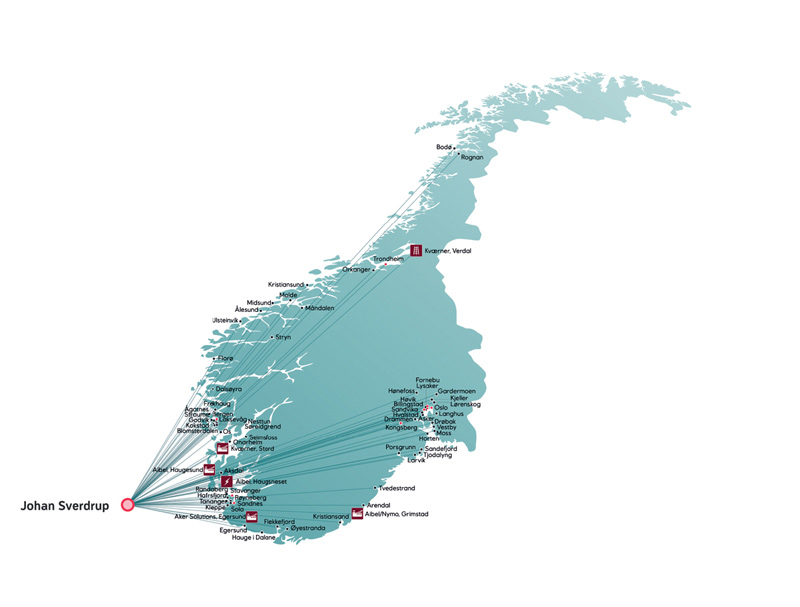 Sverdrup-feltet er forventet å gi inntekter på 900 mrd. kroner til staten. I tillegg til dette gir både utbyggingen og driften av feltet store ringvirkninger spredt ut over landet. Illustrasjonen i figur 6.3 viser spredningen av bedrifter som har fått leveranser til utbyggingen av feltet. Equinor, som er operatør for feltet, har beregnet at utbyggingen av feltet gir 150 000 årsverk i Norge i perioden 2015–2025. Dette fordeler seg med om lag 45 prosent i leverandørbedrifter, 30 prosent i underleverandørbedrifter og om lag 25 prosent i etterspørselsvirkninger i andre virksomheter. I driftsfasen er Sverdrup beregnet å generere årlig om lag 3 400 årsverk i norske bedrifter.
