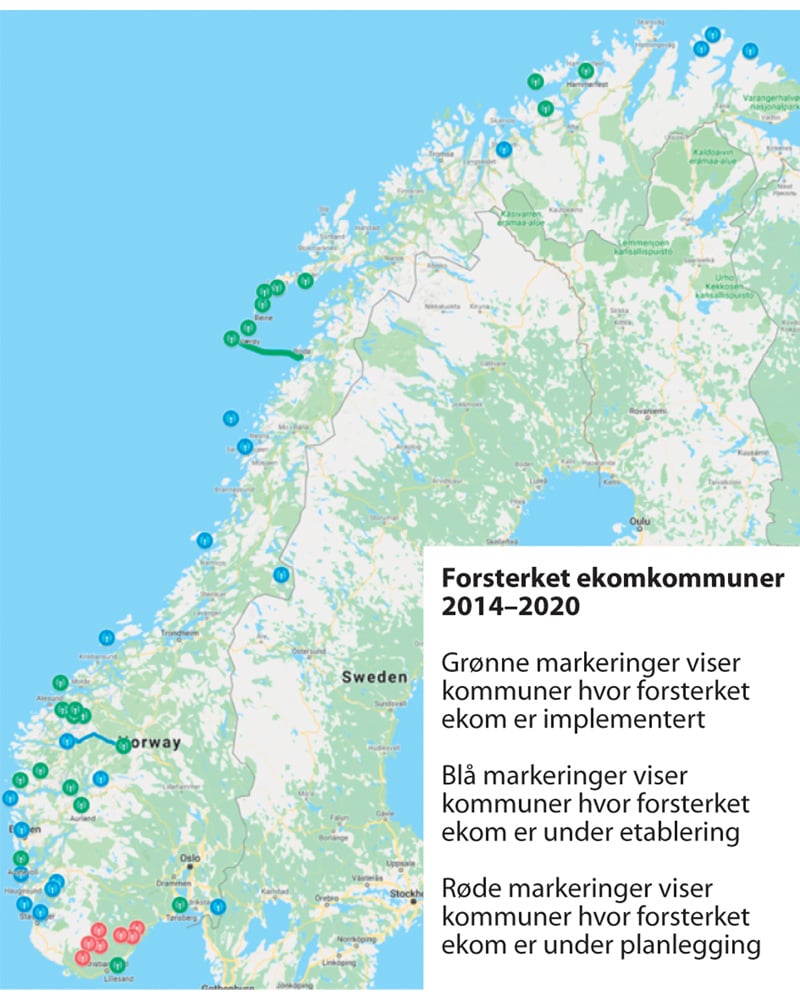 Figur 9.1 Oversikt over kommuner med forsterket ekom i perioden fra 2014 til planlagt i 2020.