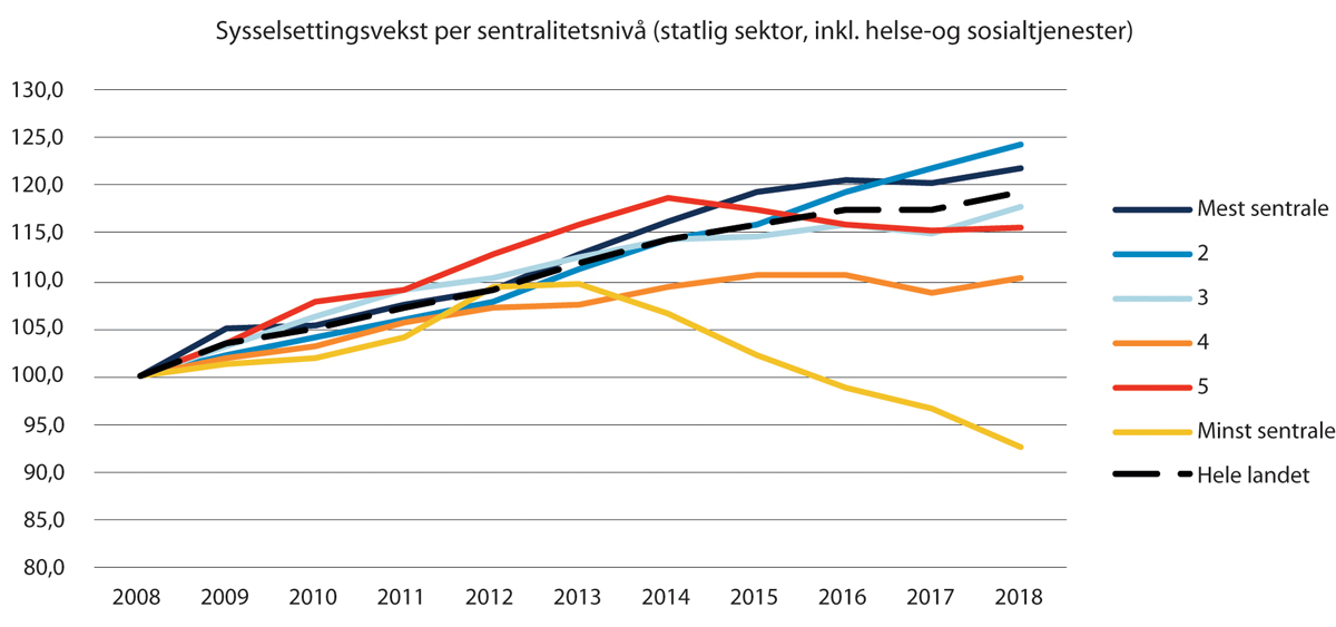 Figur 9.2 Endring i statlig sysselsetting (statlig forvaltning, inkl. helse) etter sentralitet 2008–2018