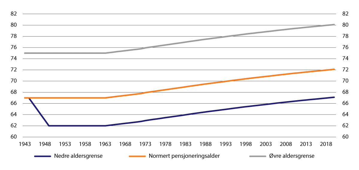 Figur 8.1 Aldersgrensene i pensjonssystemet for årskullene 1943–2020. Framskrevet fra 1964-årskullet. Alder