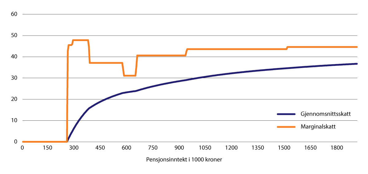 Figur 8.2 Marginal- og gjennomsnittsskatt på pensjonsinntekt 2023. Prosent