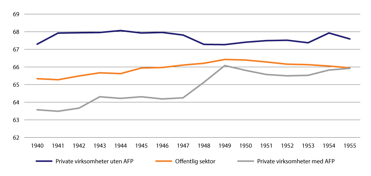 Figur 9.1 viser median avgangsalder blant arbeidsføre i årskullene 1940–1955 fordelt på sektor og AFP-tilhørighet. Med arbeidsføre menes personer som var yrkesaktive ved 61 år, som verken mottok uføretrygd eller arbeidsavklaringspenger i alderen 61–66 år og som var i live til minst fylte 67 år. Avgang er i denne sammenheng definert som at en er helt ute av arbeidslivet.