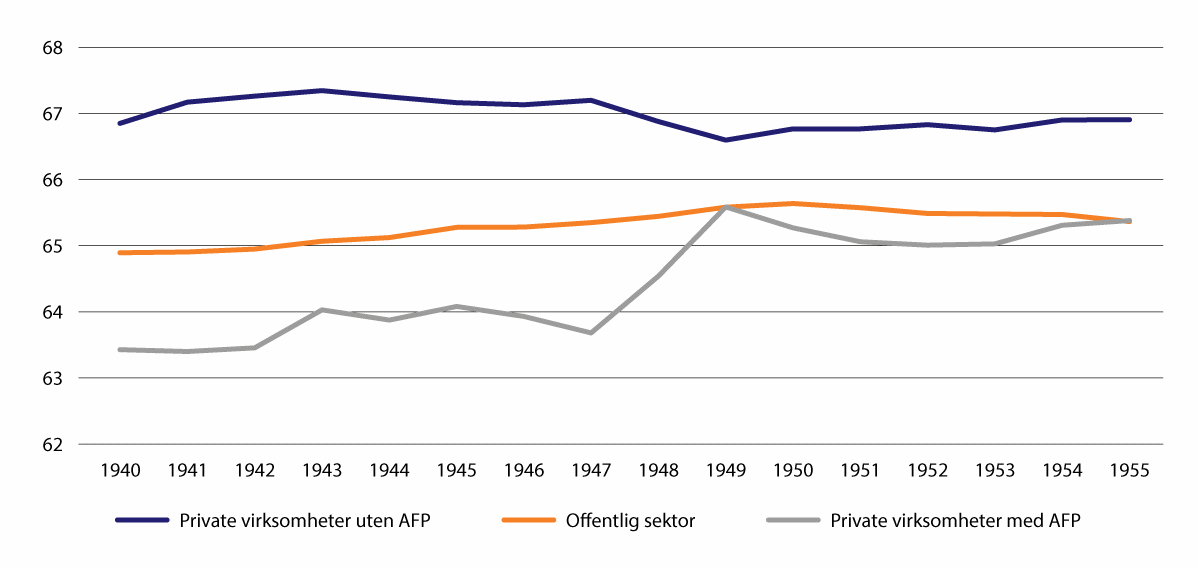 Med unntak av ansatte i private AFP-virksomheter, som med ny AFP fikk vesentlig styrket sine arbeidsinsentiver, er det altså så langt ingen tydelige indikasjoner på at flertallet av de arbeidsføre står lenger i arbeid. Yngre årskull har noe lavere avgang fra arbeidslivet ved 62 år, og det er noen flere som er sysselsatt utover 67 år, men median avgangsalder for personer som ikke har rett til privat AFP er om lag uendret i den siste tiårsperioden.