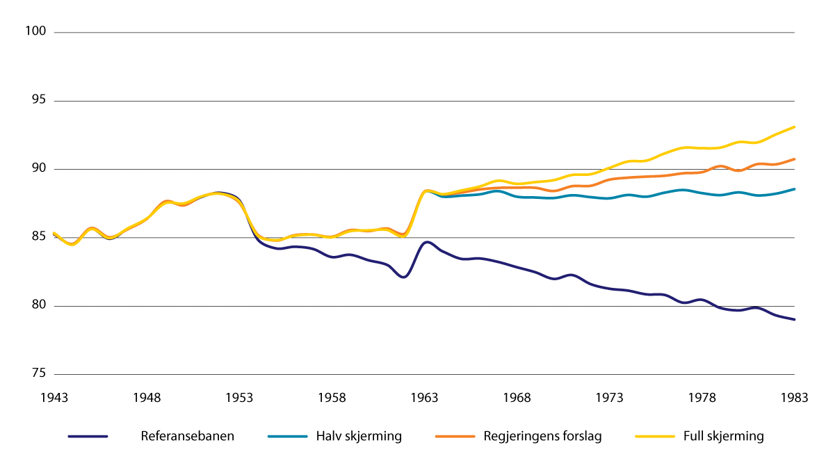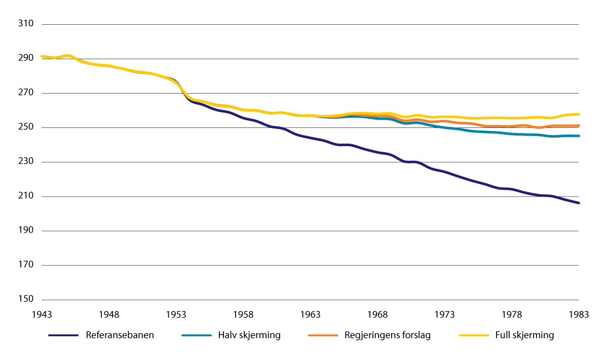 Figuren viser videre gjennomsnittlig pensjonsnivå med hhv. halv og to tredjedelers skjerming for virkning av levealdersjustering, hvor to tredjedelers skjerming er operasjonalisert ved at øvre alder for opptjening holdes fast på 65 år for uføre, og overgang til alderspensjon skjer ved normert pensjoneringsalder. Med halv skjerming vil uføres gjennomsnittlige alderspensjonsnivå reduseres med om lag fem prosent fra 1963-kullet til 1983-kullet. Når halv skjerming medfører at gjennomsnittlig ytelse bare reduseres med om lag en tredjedel, skyldes dette at mange uføre har lav opptjening og derfor mottar en avkortet garantipensjon. Garantipensjonen reguleres med lønnsveksten i reformalternativene, og dette bidrar sammen med skjermingen til økt gjennomsnittlig alderspensjon for uføre i yngre årskull. Regjeringens forslag, som innebærer om lag to tredjedels skjerming, gir en reduksjon i gjennomsnittlig ytelse for uføre på om lag to prosent fra 1963-kullet til 1983-kullet.