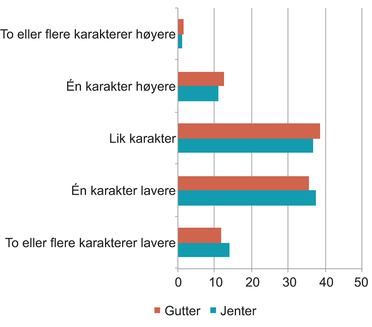 Undersøkelser viser at kjønnsforskjellene i videregående opplæring er større i standpunktkarakterer enn til eksamen. Kjønnsforskjellene skyldes først og fremst at gutter får lavere standpunktkarakterer enn jenter, og derfor oftere går opp i karakter til eksamen, se figur 2.2. Sammenligner en derimot gutter og jenter med samme standpunktkarakter, er det gutter som i størst grad får lavere karakter til eksamen.