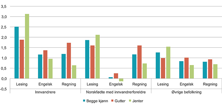 Figur 2.3 viser at elever med innvandrerbakgrunn har en betydelig sterkere forbedring av egne prestasjoner i lesing enn øvrige elever. De har også en noe sterkere prestasjonsutvikling i regning. I engelsk derimot, er prestasjonsutviklingen betydelig svakere blant norskfødte med innvandrerforeldre enn blant innvandrere og øvrige elever.