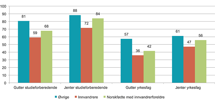 Gutter med innvandrerbakgrunn er noe sjeldnere med i idrettslag enn hva andre gutter er. Jenter med innvandrerbakgrunn deltar imidlertid i mye mindre grad enn andre jenter.72 Forskjellene mellom gutter og jenter med innvandrerbakgrunn er mye større enn forskjellene mellom gutter og jenter i den øvrige befolkningen. Når det gjelder fysisk aktivitet generelt og trening utenfor idrettslag, som på treningssenter, er forskjellene mellom barn og unge med og uten innvandrerbakgrunn langt mindre.