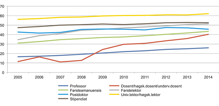 Forskningsinstituttene er en uensartet gruppe og varierer med hensyn til faglig innretning, arbeidsoppgaver, brukere, organisasjonsform, finansiering og historisk bakgrunn. Av forskerne og annet faglig personale i instituttsektoren var 41 prosent kvinner i 2012. I 2013 var kvinneandelen av forskerårsverkene 48 prosent ved de samfunnsvitenskapelige instituttene, 46 prosent ved primærnæringsinstituttene, 40 prosent ved miljøinstituttene og 26 prosent ved de teknisk-industrielle instituttene.68 Det ble avlagt 97 doktorgrader ved disse instituttene dette året (hvor minst 50 prosent av arbeidet ble utført ved eller finansiert av instituttet), 56 av kvinner og 41 av menn.