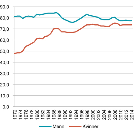 Figur 3.2 Utvikling i sysselsettingsrate for kvinner og menn i Norge. 1972–2014. 15–64 år.