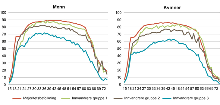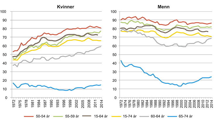 I 2014 var det bare 4 prosentpoeng flere menn enn kvinner som deltok i arbeidslivet. Kvinners yrkesaktivitet har økt fra under 50 prosent på 1970-tallet til 74 prosent i 2014 (15–64 år), se også figur 3.2. I samme periode er menns yrkesaktivitet blitt redusert fra over 80 prosent til 77 prosent. Sysselsettingsraten både for menn og kvinner er blitt redusert de siste årene og er nå mer på linje med sysselsettingen i begynnelsen av 2000-tallet. Årsaken til dette er blant annet noe svakere konjunkturer, en aldrende befolkning med flere eldre i arbeidsdyktig alder og økt innvandring. Sysselsettingsratene både for menn og kvinner har økt for aldersgruppen over 60 år. For kvinner har det også vært en økning fra 55 år og oppover. Nedgangen i sysselsettingsraten siden 2008 har altså blitt noe dempet ved at flere eldre nå er i arbeid enn tidligere. Men sysselsettingsratene for personer over 50 år, er fremdeles høyere for menn enn for kvinner.