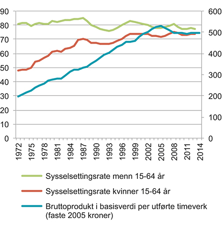 Likestilling lønner seg, ikke bare for den enkelte, men også for samfunnet. Siden 1930 har verdiskapingen i Norge utenom petroleumssektoren blitt syvdoblet i realverdi. Det aller meste av dette skyldes økt arbeidsproduktivitet.1 Norge ligger på topp i OECD når det gjelder arbeidsproduktivitet. Kvinners økte sysselsetting har bidratt til denne sterke veksten i verdiskaping, se figur 3.4.