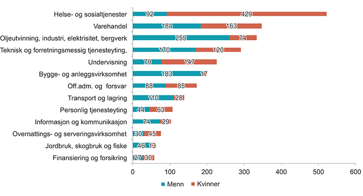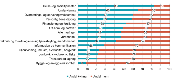 Mange næringer er enten mannsdominerte eller kvinnedominerte. Helse- og sosialtjenestene har størst andel kvinner, over 80 prosent. I undervisningssektoren er 65 prosent av alle sysselsatte kvinner. I motsatt ende har en næringer som transport, jord, skogbruk og fiske, industri og oljeutvinning hvor nærmere 80 prosent av de sysselsatte er menn.