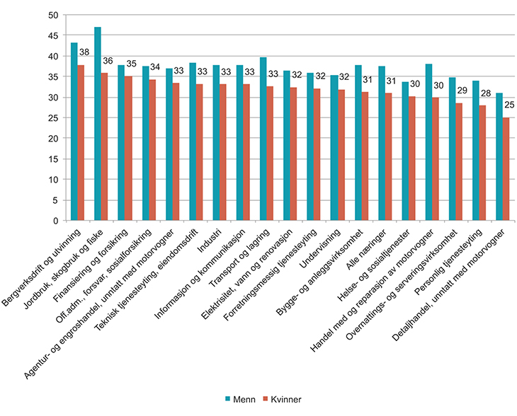 Ser en på antallet som jobber i de ulike næringene, er helse- og sosialtjenester den største næringen med 520 000 sysselsatte, se figur 3.6. Her jobber 34 prosent av alle kvinner og syv prosent av mennene.
