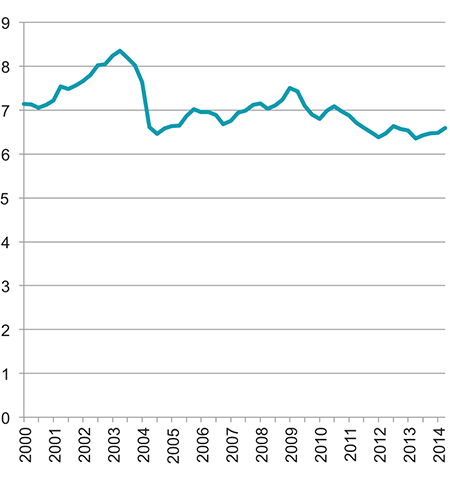 Figur 3.9 Totalt sykefravær. Sesongjusterte kvartalsvise tall. 2. kvartal 2000 – 3. kvartal 2014. Prosent.