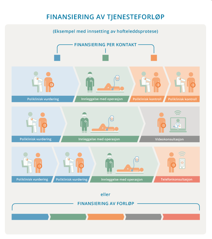 Bundled payments: Finansieringsordninger som kan være episodebaserte, gjelde konkrete aktiviteter og for eksempel være innrettet etter informasjon om hva som er beste praksis. Slike ordninger kan også være innrettet etter pasientforløp i tjenesten. Finansieringen vil da være knyttet til et definert pasientforløp – ikke til konkrete enkeltaktiviteter innad i forløpene, og kan understøtte kostnadseffektive og koordinerte tjenester. Helsedirektoratets arbeid for mer forløpsbasert finansiering reflekterer en slik utvikling.