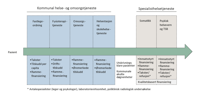 Det vesentligste av kommunenes utgifter til helse- og omsorgstjenester er finansiert gjennom skatteinntekter og rammetilskudd fra staten. Dette betegnes som kommunenes frie inntekter. I tillegg finansieres kommunale helse- og omsorgstjenester gjennom øremerkede tilskudd fra blant annet staten, egenbetaling fra pasienter og brukere og gjennom takster. Privatpraktiserende behandlere, som fastleger og fysioterapeuter med avtale, er finansiert gjennom ulike blandingsmodeller. Disse inneholder tilskudd fra kommunene, betaling fra pasientene og refusjoner fra folketrygden, fastsatt gjennom årlige takstforhandlinger mellom staten og profesjonsorganisasjonene.