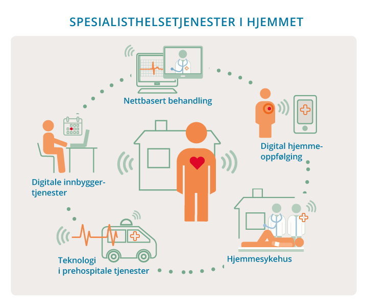 Medisinsk og teknologisk utvikling gjør det mulig å yte spesialisthelsetjenester med medisinsk utstyr utenfor sykehus. Dette har særlig stor verdi for pasienter som er sårbare for forflytning, har stor infeksjonsfare og i områder med store avstander. Flere helseforetak har innført avansert hjemmesykehus, jf. omtale i avsnitt 4.4.1. Så langt er omfanget av medisinsk utstyr som kommuniserer med sykehuset over nett begrenset i disse løsningene. Bruk av slik teknologi er forventet å øke.