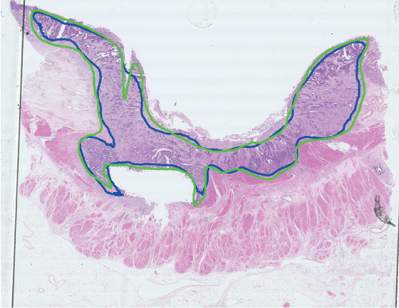 Figur 7.3 viser en markering av et svulstområde utført av en datamaskin ved hjelp av dyp læring. Den grønne linjen i bildet av det rosa snittet er markert av en patolog, den blå av en datamaskin. Datamaskinen finner svulsten og forutsier pasientens prognose med stor grad av nøyaktighet.