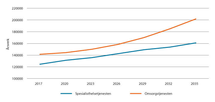 Vi trenger flere enn vi får. SSB anslår at antall årsverk i den samlede helse- og omsorgstjenesten må øke med om lag 35 prosent frem mot 2035 for å dekke fremskrevet behov for helse- og omsorgstjenester. I så fall vil helse- og omsorgssektoren legge beslag på nesten halvparten av den samlede veksten i arbeidsstyrken. Det vil fortrenge mye annet som samfunnet ønsker å bruke ressursene på. For å unngå en slik utvikling, kreves endringer i måten oppgavene løses på, mer bruk av teknologi og økt kompetanse som reduserer bemanningsbehovet.