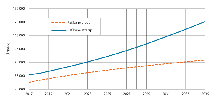 Figur 9.3 Fremskrevet utvikling i tilbud og etterspørsel for sykepleiere frem til 2035. SSBs referansebane