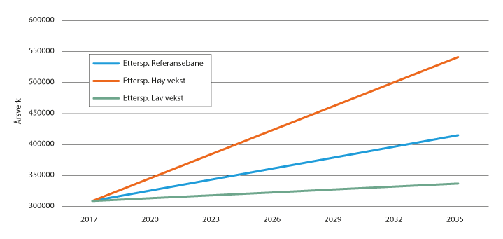 Figur 9.5 Samlet etterspørsel etter årsverk i helse- og omsorgssektoren fremskrevet til 2035. Referansebane og scenario med hhv. høy og lav vekst.
