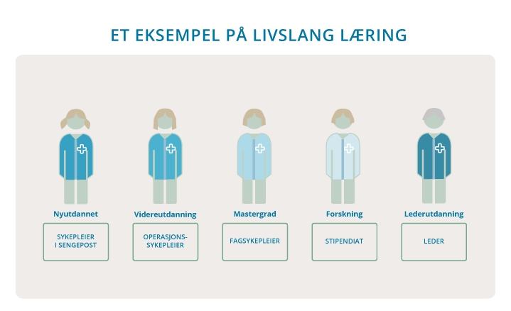 De første årene i arbeid etter grunnutdanningen er kritiske for om en medarbeider fortsetter yrkeskarrieren i helse- og omsorgstjenesten. Mange har behov for god veiledning og supervisjon i arbeidssituasjonen, og det må legges til rette for det. I det videre yrkeslivet må arbeidsgiver være tydelig på hva slags videre- og etterutdanning det er behov for, både i klinisk arbeid, fagutvikling og forskning. Det gir grunnlag for livslang læring for de ansatte. Livslang læring gir virksomheten tilgang til nødvendig og oppdatert kompetanse. For arbeidstakere er det et virkemiddel for kompetanseheving, å håndtere endring, trygghet i yrkesutøvelsen og motivasjon i arbeidet.