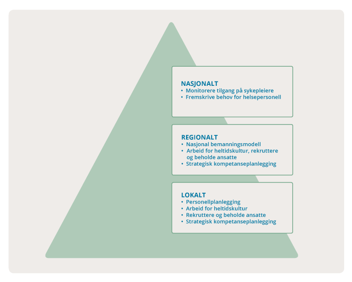 Innsatsen for å øke andelen ansatte som arbeider heltid og for å beholde ansatte må fortsette. Arbeidet for livslang læring og omstillingsevnen må forsterkes. Det må arbeides mer i tverrfaglige team, kompetanse må deles på tvers i hele helse- og omsorgstjenesten, ny kunnskap må tas raskere i bruk, innovative tjenestemodeller må utvikles og brukes, og teknologi må utnyttes i helse- og omsorgssektoren. Dette forutsetter god ledelse som planlegger strategisk for bemanning og kompetanseutvikling på kort, mellomlang og lang sikt.
