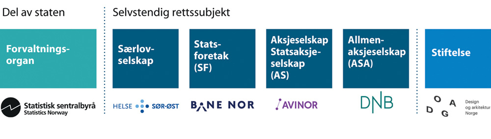 Statens oppgaveløsning kan organiseres som en del av staten, og da gjerne som forvaltningsorgan, eller som et selvstendig rettssubjekt, det vil si en form for selskap eller stiftelse, se figur 3.2. Når staten bruker selskapsformen som virkemiddel gir det andre rammer for styringen enn om oppgaven løses av et forvaltningsorgan. Figur 3.2 Ulike måter for staten å organisere virksomhet, med eksempler.