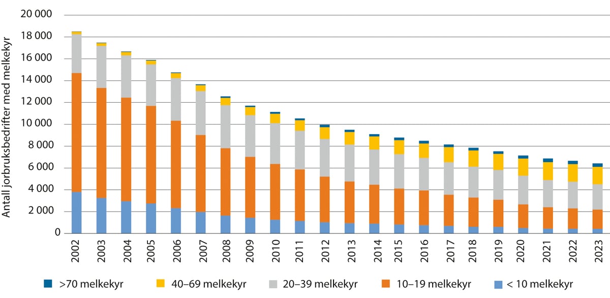 Figur 3.1 Antall jordbruksbedrifter med melkekyr etter antall melkekyr, 2002–2023 (Foreløpige tall 2023.)