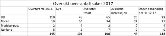 I 2017 registrerte Sentral kontrollenhet 101 nye saker. I samme periode ble 108 saker avsluttet. Av disse ble 44 avsluttet med reaksjon; 43 med tilbakebetaling og én med oppsigelse. Det ble i 2017 tilbakebetalt 13.066.320 kroner. 43 av de avsluttede sakene med reaksjon er knyttet til programområde 03 Internasjonal bistand. Tallene omfatter også saker under Norads, Fredskorpsets og Norfunds ansvarsområder.