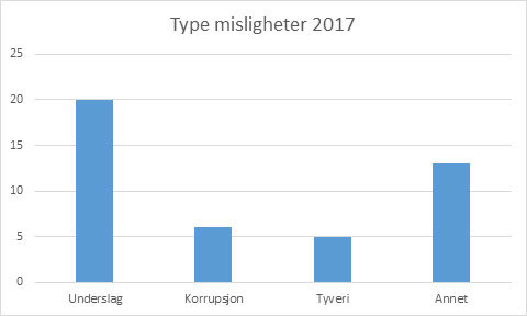 Om lag halvparten av de 44 avsluttede sakene med reaksjon i 2017 dreier seg om underslag, mens seks dreier seg om korrupsjon og fem om tyveri. I kategorien «annet» finner en manglende rapportering, midler brukt til annet enn avtalt formål mv.