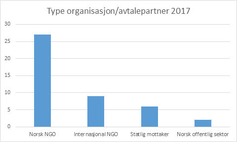 27 av de 44 sakene med reaksjon i 2017 dreier seg om norske ikke-statlige organisasjoner (NGO-er). Misligheten i de aller fleste av disse sakene fant sted hos organisasjonens lokale partner, men enkelte av sakene var knyttet til den norske organisasjonens egne lokalt ansatte.