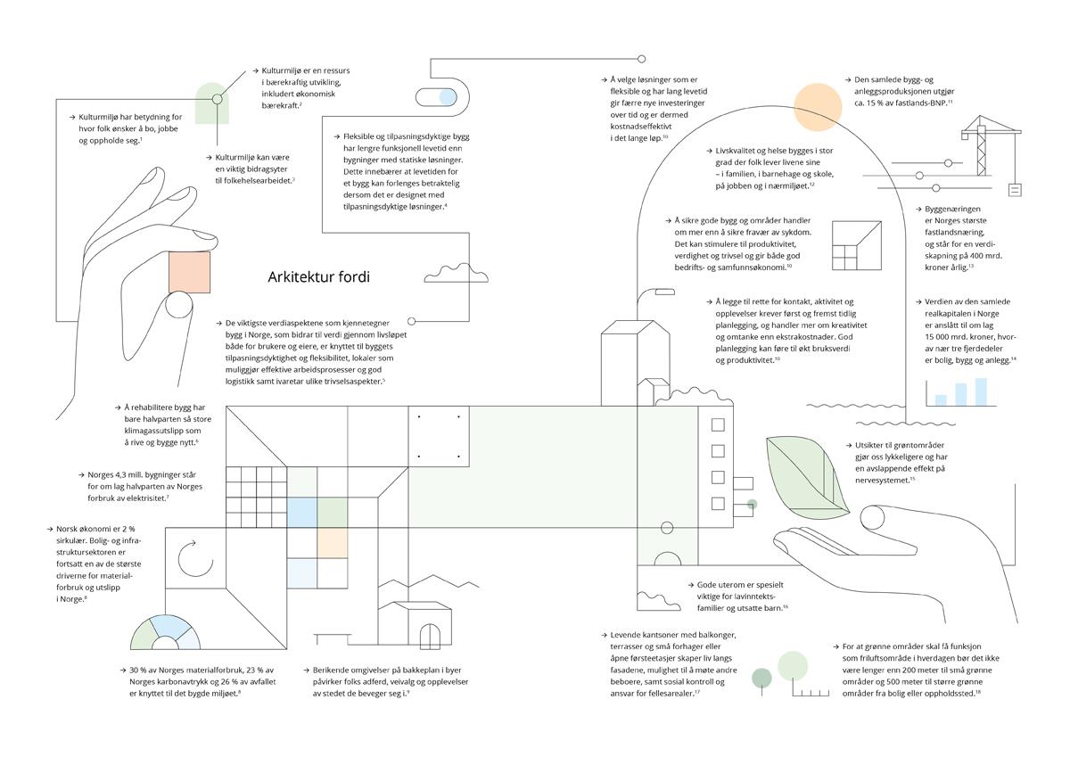Regjeringens ambisjon er at vi utvikler bygninger , nabolag og byer som er vakre og berikende for mennesker og miljø – for økt livskvalitet. Det bygde miljø utgjør en viktig del av kulturarven, og arkitekturen forteller om vår historie og samfunnsutvikling. Det som bygges i dag kan bli morgendagens kulturarv. Kunnskap om arkitekturens betydning og verdi bør synliggjøres og formidles gjennom en bred samfunnsdebatt.