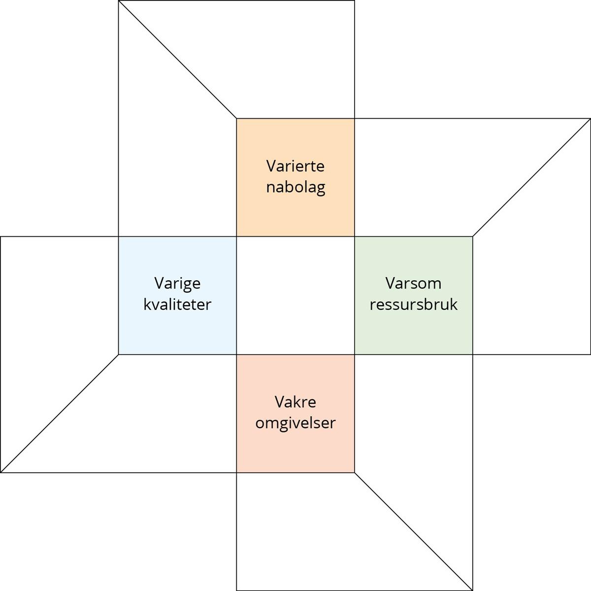 Dette er strategiens fire innsatsområder, som også kan brukes som et verktøy for diskusjon om hva som gir arkitektonisk kvalitet – i overordnede planprosesser, lokale strategiarbeid eller reguleringsplaner og byggesaker.