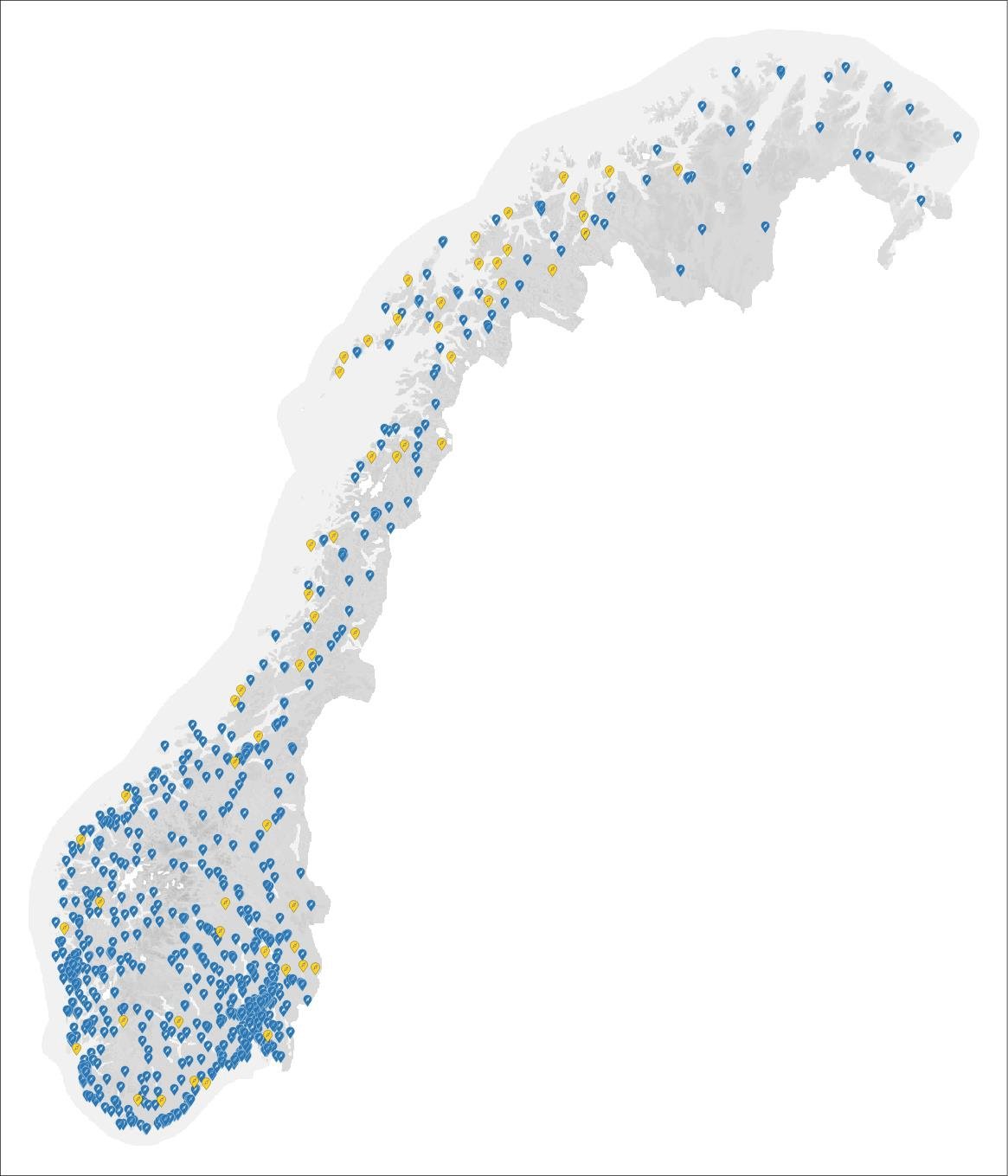 Figur 5.1 Hurtigladestasjoner i drift per november 2022 (blå) og hurtigladestasjoner støttet av Enova juni 2022 som settes i drift senest juni 2023 (gul).