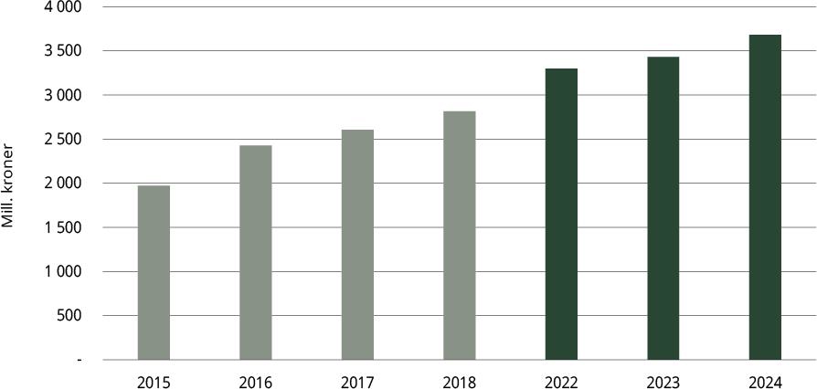 Figur 4.4 Utvikling i omsetningsverdi for økologiske matvarer (norsk og importert) i dagligvarehandelen i perioden 2015 til 2024, unntatt årene 2019 til 2021.