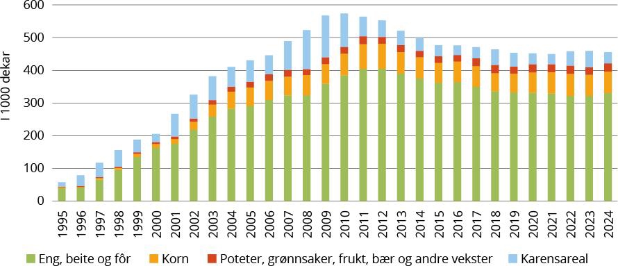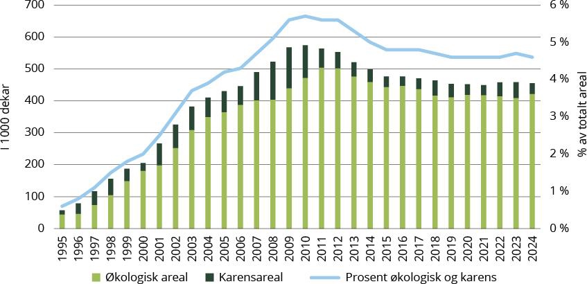Figur 4.2 Utviklingen i økologisk drevet areal for planteproduksjon og karensareal i perioden 1995 til 2024.