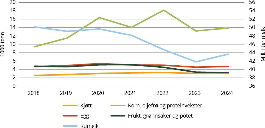 Figur 4.3 viser utviklingen i produksjonen av ulike økologiske jordbruksvarer i perioden 2018−2024. Etter en betydelig nedgang i produksjonen av økologisk melk fra 2018 til 2023 har produksjonen økt det siste året. Det har også vært en økning i produksjonen av økologisk kjøtt siden 2018, mens produksjonen av økologiske egg har vært stabil. Produksjon av økologisk korn, oljefrø og proteinvekster har i stor grad fulgt svingningene i totalproduksjonen. Den lave kornproduksjonen i 2018 skyldes eksempelvis tørkesommeren. For økologisk frukt, grønnsaker og potet har det vært en nedgang i gjeldende periode.