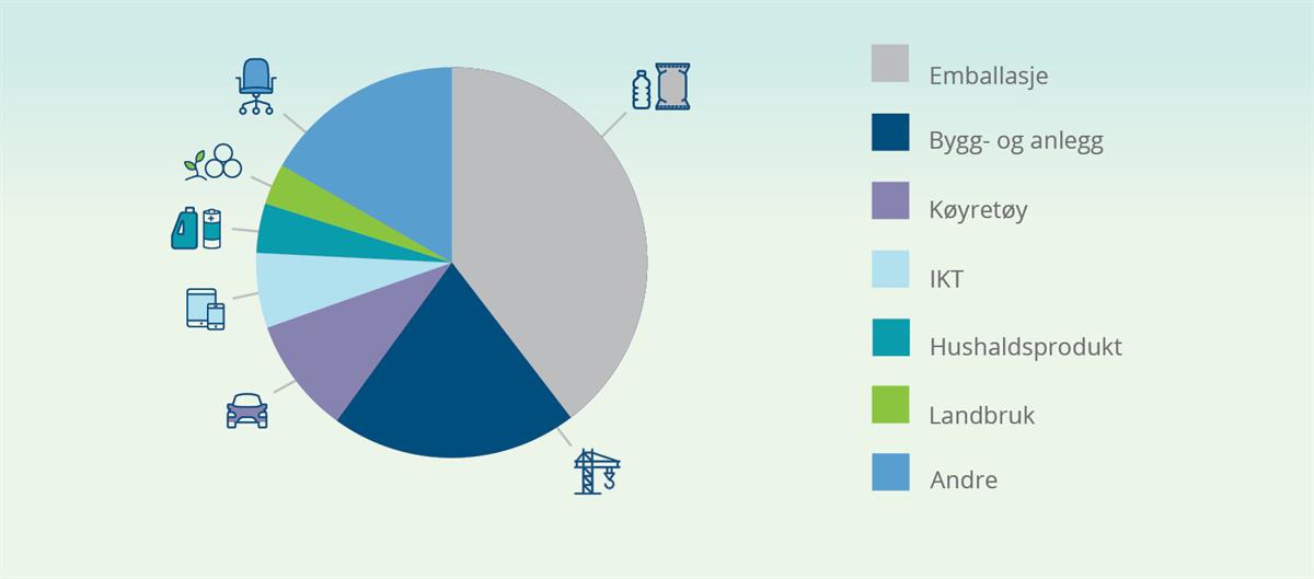 I samsvar med tal frå 2020 frå «Plastics Europe»19 er plast til emballasje framleis den klart største forbrukskategorien for plastmateriale på den europeiske marknaden, med rundt 40 prosent av dei totalt 51 millionar tonn plast som vart brukte i 2019. Dei neste store forbrukskategoriane er plast som inngår i samansette produkt, der dei største bruksområda er bygg (ca. 20 prosent), køyretøy (ca. 10 prosent) og elektronikk (ca. 6 prosent).