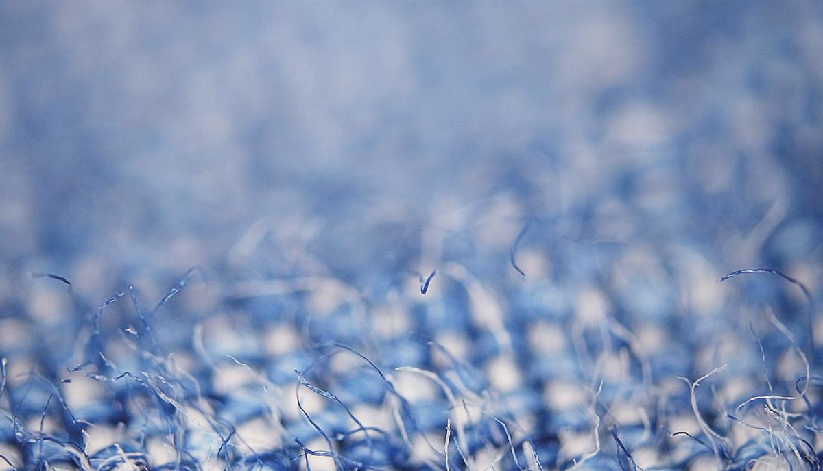 Mikrofiber i blå jeans. Jeans kan innehalde både bomull og syntetiske tekstilar. Mikroplast, slik som fibra her, blir frigjord ved bruk og klesvask av syntetiske tekstilar. Foto: Adobe Stock