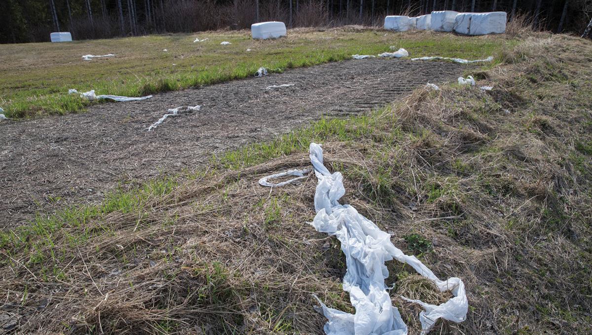 Plastemballasje frå høyballar kjem lett på avvegar i naturen. Foto: NTB, Vidar Ruud