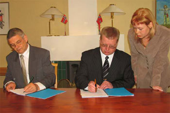 Foto: Nerpa-verftet. Kontrakten ble undertegnet fra norsk side av prosjektleder Bjørn Borgaas, Storvik & Co (t.v.), og fra russisk side av direktøren for Nerpa-verftet, Aleksandr Gorbunov (t.h.)