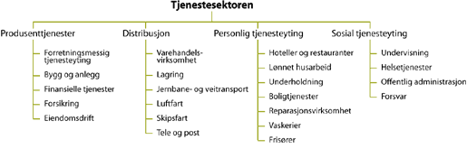 Tjenesteytende sektor omfatter næringsvirksomhet med stor spennvidde, jf. figuren under. Sektoren dekker alt fra desentraliserte tjenestebransjer som følger bosettingsmønsteret i landet, til tjenester som tilbys på et internasjonalt konkurranseutsatt marked.