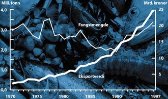 Fangstmengde og eksportverdi (Lakseoppdrett er inkludert). Eksporten av norsk fisk og fiskeprodukter har vokst kraftig siden begynnelsen av 70-tallet, og var i 1999 oppe i 30 mrd. kr. Lakseeksporten utgjør 31 pst. av den totale fisk- og fiskevareeksporten fra Norge. I følge FAOs statistikk for 1997 er Norge verdens største eksportør av sjømat. Kilder: Utenrikshandelstatistikk, Statistisk sentralbyrå og Fiskeridirektoratet