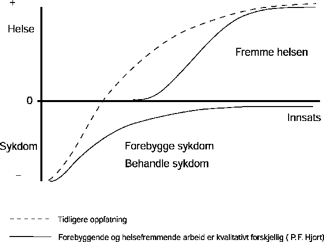 WHOs definisjon av helse lyder: «Helse er ikke bare frihet fra sykdom og lyte, men fullstendig legemlig, psykisk og sosialt velvære». Mange regner denne definisjonen som altfor ambisiøs til å gi et godt bilde på hva god helse innebærer, og har forkastet den. Mange er f.eks. fornøyd med helsen opp gjennom livet, til tross for at de har gått gjennom både alvorlige og plagsomme lidelser. Resultatene fra helseundersøkelser i mange land har dessuten vist at en stor andel av befolkningen har vært kronisk syke, uten å være misfornøyd med helsen. Resultatet av den norske helseundersøkelsen i 1985 viste bl.a. at størstedelen av de som oppga å ha en sykdom/diagnose, allikevel var fornøyd med egen helse. Et godt liv er således ikke nødvendigvis det samme som god helse i betydningen lite sykdom. Det er mulig å leve et rikt liv med en funksjonshemming eller en alvorlig sykdom. Det er også mulig å gå gjennom livet uten å ha vært syk en dag, men med en følelse av å ikke ha utrettet eller oppnådd noe. Et godt liv er heller ikke nødvendigvis et langt liv. Spenningsforholdet mellom objektive og subjektive mål for helse er vanskelig å forklare. Det kan imidlertid argumenteres for en definisjon av helse som understreker mestringsbegrepet. Det innebærer at det er nødvendig å se begge sider av menneskelivet - problemer og mestringen av problemene - under ett, og at det ikke nødvendigvis finnes noe absolutt skille mellom det å ha god helse og det å være syk. Derfor må arbeid med å fremme helse og bekjempe sykdom ses i nær sammenheng. Det har vært vanlig å se dette som en sammenhengende prosess, som innebærer at det helsefremmende arbeid begynner der det sykdomsbekjempende arbeid slutter, slik det er illustrert ved den stiplede linjen i figur 3.1. Sannsynligvis er det imidlertid mer hensiktsmessig å se disse to strategiene som atskilte prosesser, og den totale helsetilstand som en funksjon av begge. Ved å velge riktige strategier for bekjempelse og forebygging av sykdom, vil vi ikke bare redusere forekomsten av sykdom og gjøre de syke friskere, vi vil også øke livskvaliteten til hele befolkningen.