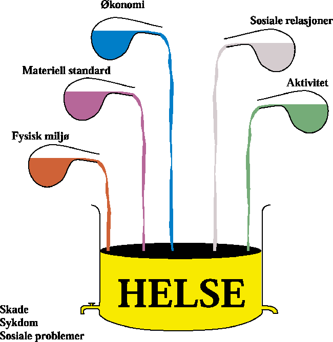 Mestringsfaktorene utgjør en blanding av personlige egenskaper, sosiale og politiske forhold. En annen, men ikke ulik, tilnærming til helsebegrepet er å se helsen som en mengde under stadig endring, jf. figur 3.2. Helsen reduseres gjennom at sykdommer, den normale aldringsprosessen eller andre, individuelle problemer tapper ut «helsekapital» i varierende grad. Men det er også mulig å øke helsemengden, ved å «fylle på» fra forskjellige faktorer som en vet har positiv innvirkning på helsen. Målet for helsetjenesten er både å «skru igjen» kranen og å øke helsen gjennom å «fylle på» med de riktige innsatsfaktorene.