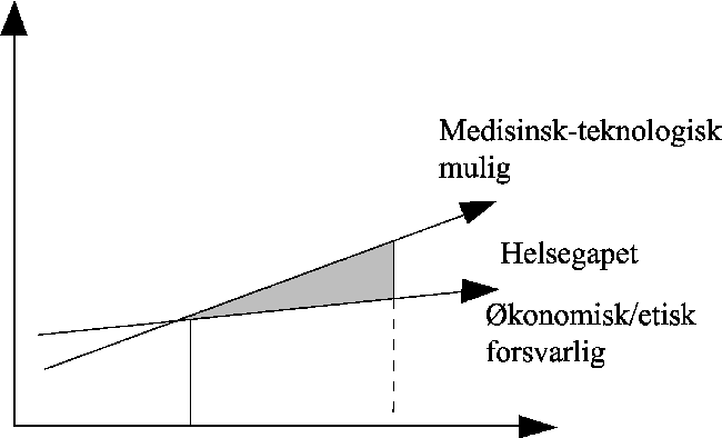 Det er blitt stadig klarere at gårsdagens gjennombrudd i den medisinsk-teknologiske utvikling, skaper dagens og morgendagens prioriteringsproblemer. Vi gjør det stadig bedre, men opplever situasjonen som stadig verre. Alle industrialiserte land sliter med hvordan de skal håndtere dette såkalte helsegapet som er forsøkt illustrert i figur 3.3.