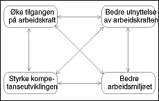 Utvalget vil understreke at disse hovedstrategiene henger nøye sammen, og vil gjensidig påvirke hverandre. En økt tilgang av arbeidskraft og kompetanse gir grunnlag for å utnytte den totale arbeidskraften på en bedre måte fordi oppgaver kan fordeles på en annen måte. Utvalgets forslag om styrking av kontorfaglige funksjoner i avsnitt 8.4.1, er et eksempel på dette. Én person utgjør ikke et faglig miljø. En økt tilgang på kompetanse vil kunne gjøre det lettere å bygge opp et faglig miljø som vil kunne styrke kompetanseutviklingen og bedre arbeidsmiljøet. En bedring av arbeidsmiljø og kompetanseutvikling vil f.eks. kunne påvirke rekrutteringsmulighetene, og utnyttelse av arbeidskraften på en mer fleksibel måte osv.