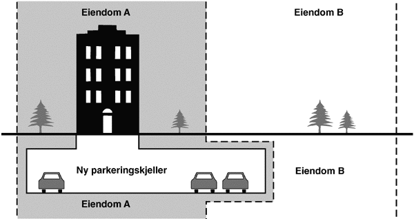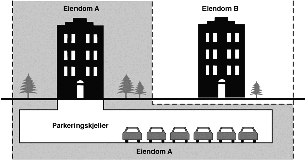 Figur 10.2 nedenfor viser eiendom A som skal bygge ny parkeringskjeller som strekker seg inn under eiendom B. Etter Oslo-modellen etableres nye eiendomsgrenser (flater) for eiendom A slik at denne også omfatter den delen av parkeringskjelleren som går inn under eiendom B. Eiendom B omfatter fremdeles grunnen over og under parkeringskjelleren.
