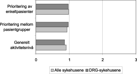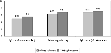 Det er som vi ser, bare små forskjeller i resultater om vi betrakter alle sykehusene samlet eller avgrenser oss til DRG-sykehusene i utvalget.
